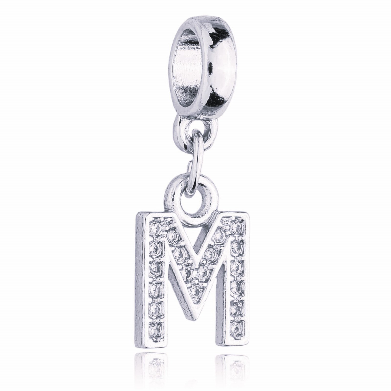 MODELO: Berloque Letra M Cravejada com Zircônia banhado com 100 milésimos de Prata 925.