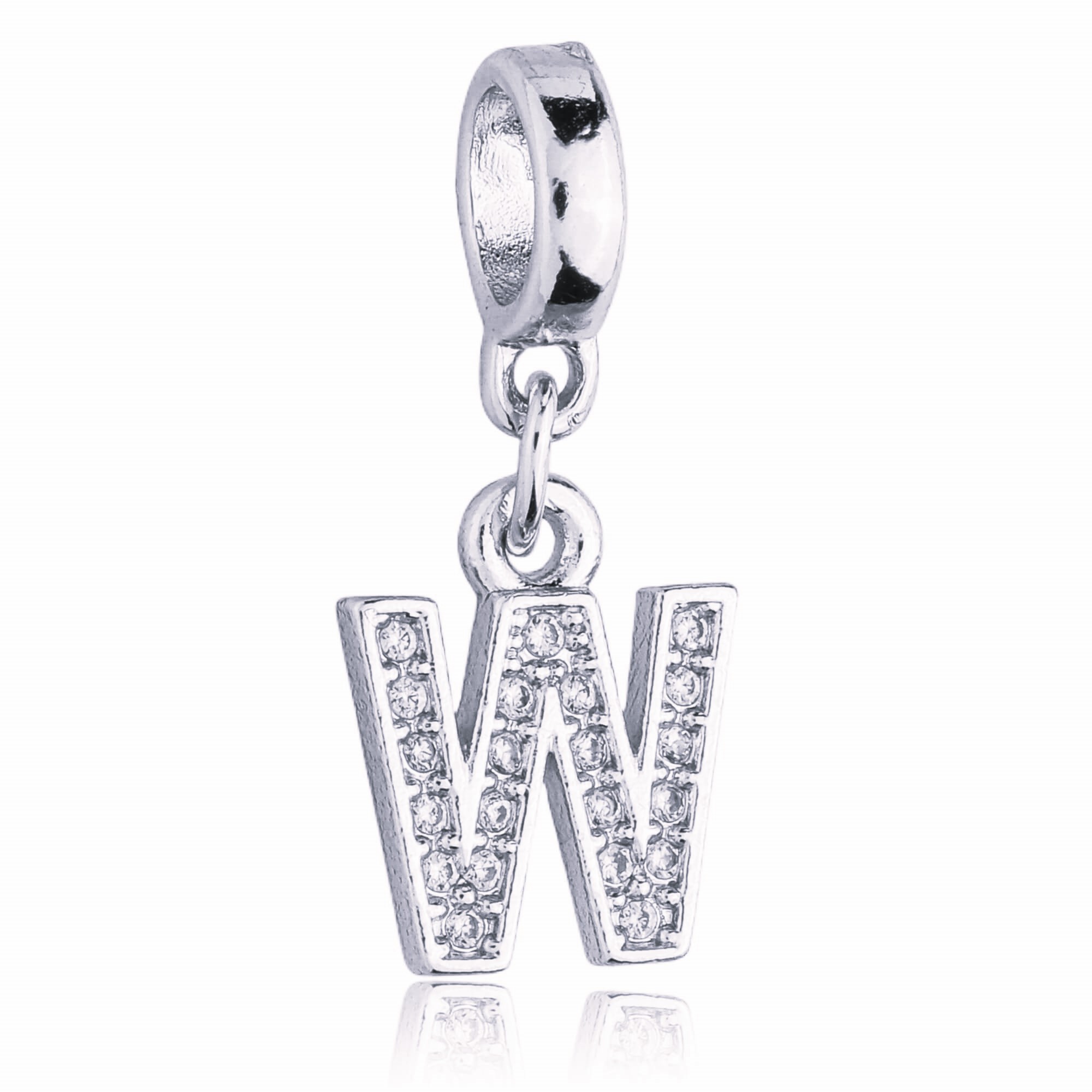 MODELO: Berloque Letra W Cravejada com Zircônia banhado com 100 milésimos de Prata 925.